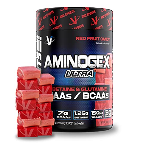 VMI Sports | Aminogex Ultra | BCAA Powder | Amino Acids + Betaine and Glutamine | Amino Acid Post Workout Recovery Drink | Intra Workout Drink with TRAACS Electrolytes | (Red Fruit Candy, 30 Servings)