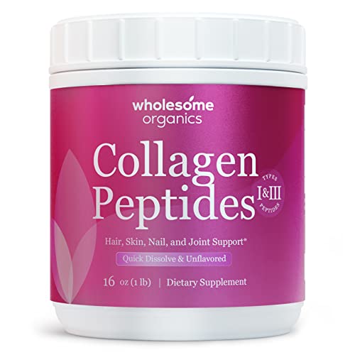 Wholesome Organics Collagen Peptides Powder (Type I & III) - Hair, Nails, Skin and Joint Health - Grass Fed & Pasture Raised - Hydrolyzed Collagen, Non-GMO, Dairy Free, & Keto - Unflavored (16 Oz)